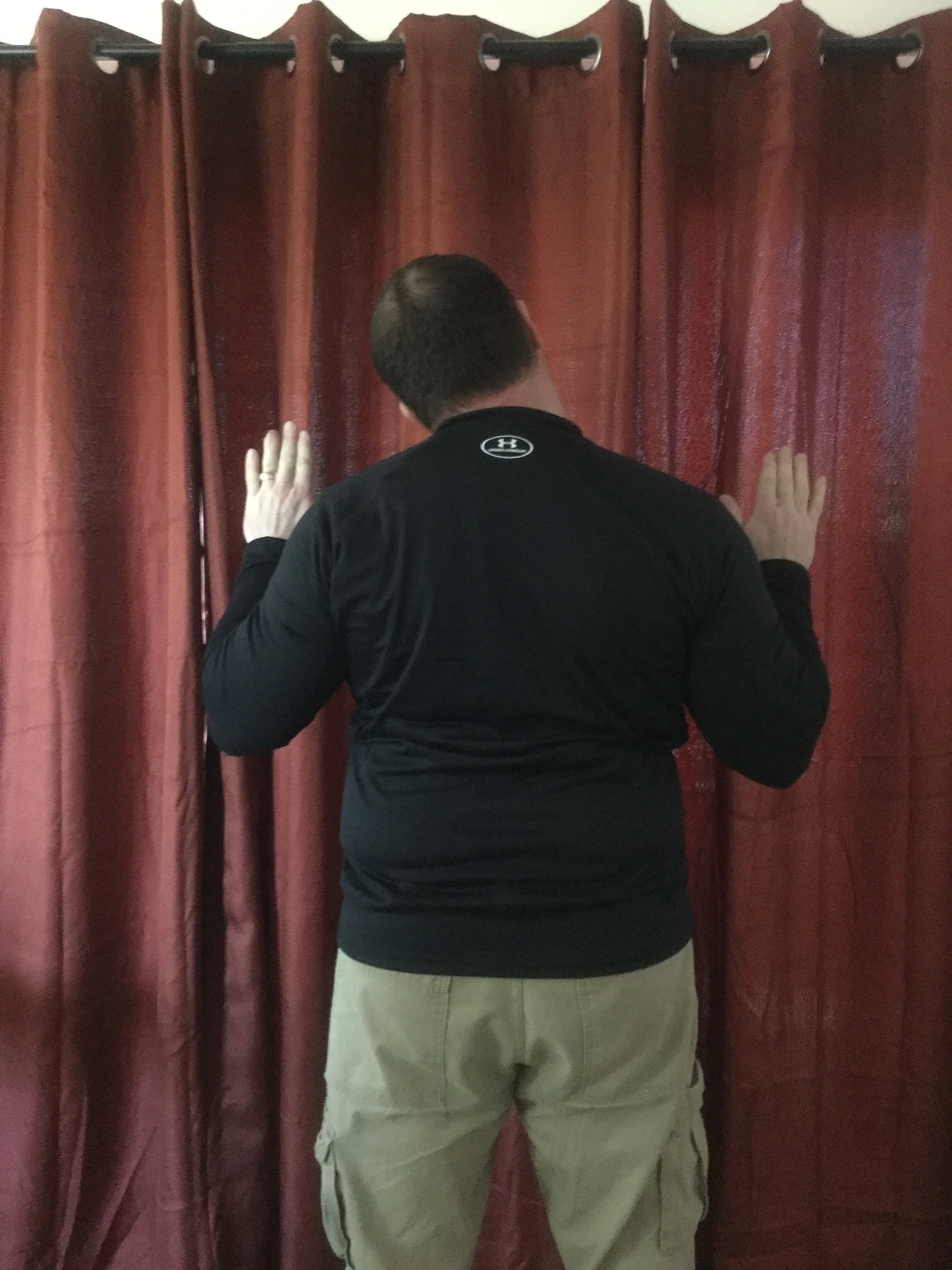 Now pull the arms down and back to your sides pinching your shoulder blades down and back. At the same time tilt your head to the opposite side that hurts. If both sides hurt do one 10-15 second hold tilting to the right and then raise your arms and repeat the arm pull down but this time tilt to the left. You can repeat these 10-15 second tilt and holds 2-3 times and then come back to them a couple times an hour if needed.
